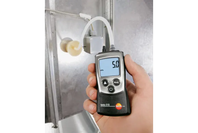 Misurazione della pressione differenziale su scaldabagni a gas o su filtri di sistemi di climatizzazione, nonché misura della portata nei condotti di ventilazione mediante un tubo di Pitot: lo strumento di misurazione della pressione differenziale testo 510, che viene fornito con un tubo di collegamento in silicone e altri accessori utili, può aiutarvi nella manutenzione e nell’installazione di sistemi nel settore sanitario e HVAC.